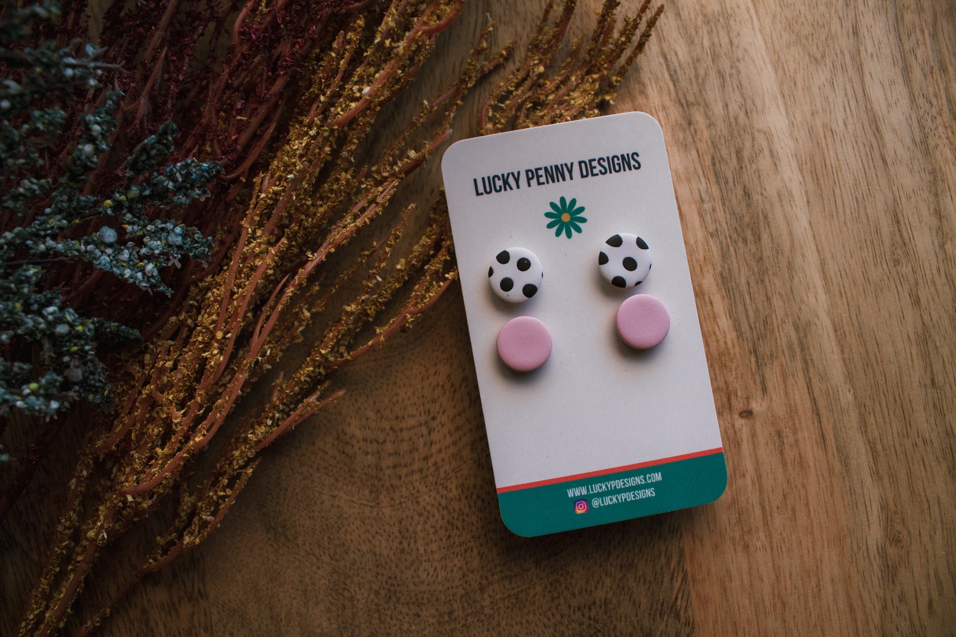 Dress up your ears with this playful pair of black and white polka dot stud earrings, accented with a pop of pink. The classic colors add a sophisticated touch while the studs keep your look effortlessly stylish. Perfect for adding a touch of whimsy to any outfit.