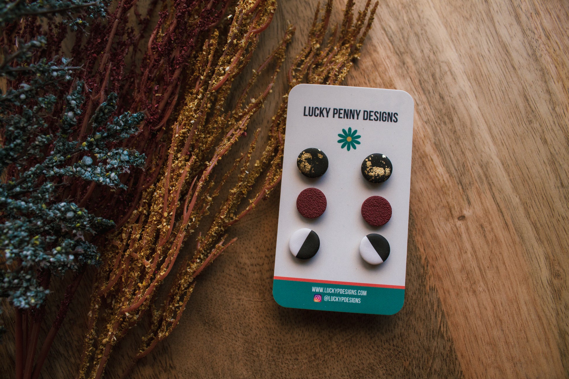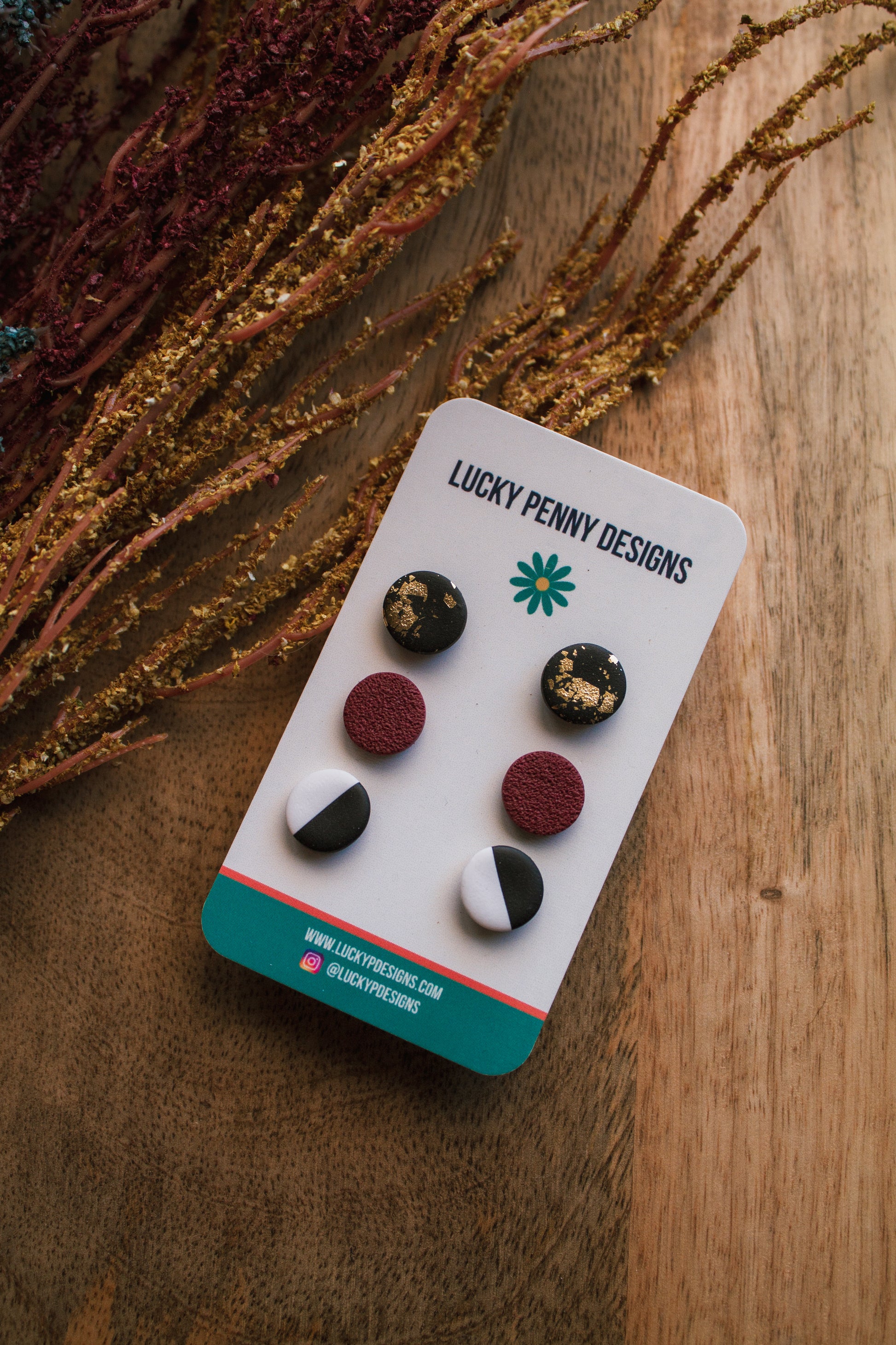 Add a touch of sophistication and playfulness to your accessory collection with our Black Marbled Stud Trio. Featuring a unique black marbled design and a chic combination of black and white stripes, these maroon studs offer a stylish and fun twist to any outfit. Elevate your look with this quirky and versatile trio.