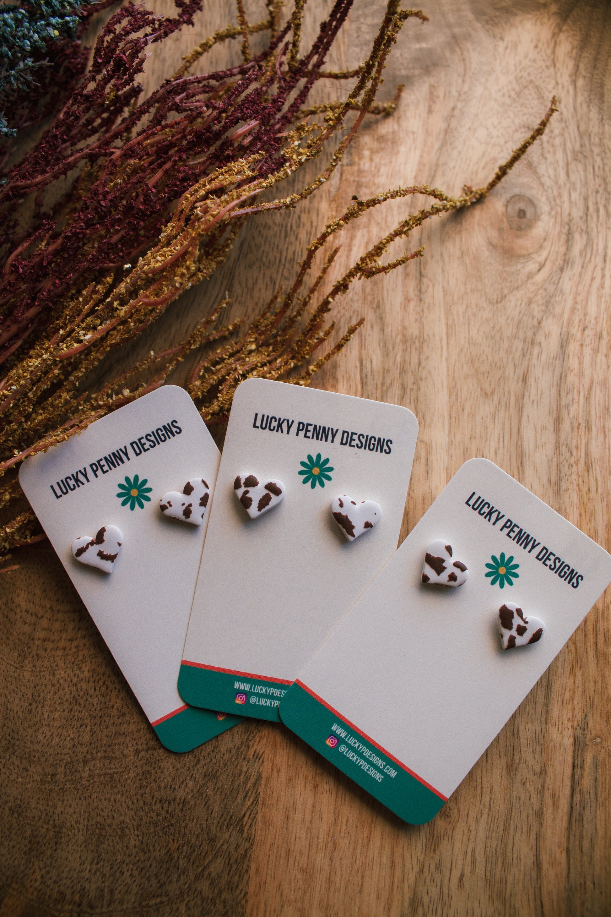 Moo-ve over plain studs, these Brown and White Cow Print Heart Studs add a playful touch to any outfit. The unique cow print design adds a quirky twist, while the heart shape adds a touch of sweetness. Perfect for animal lovers and those who don't take themselves too seriously!