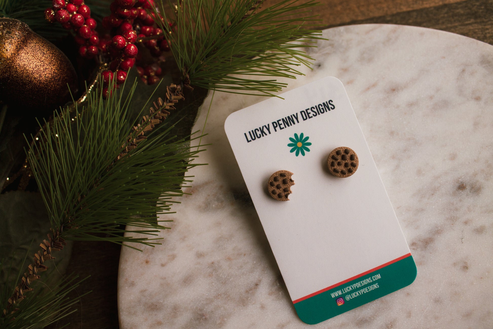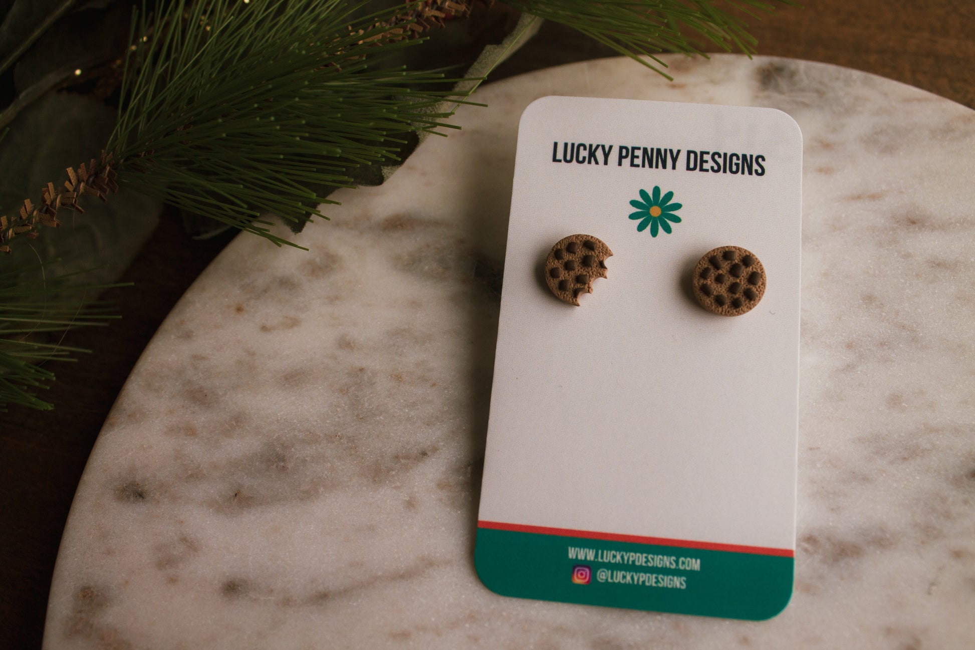 Indulge in some playful style with our Cookie Studs! These unique earrings feature a bite taken out of one cookie, adding a fun touch to any outfit. Bring a smile to anyone's face with these quirky and delicious looking studs.