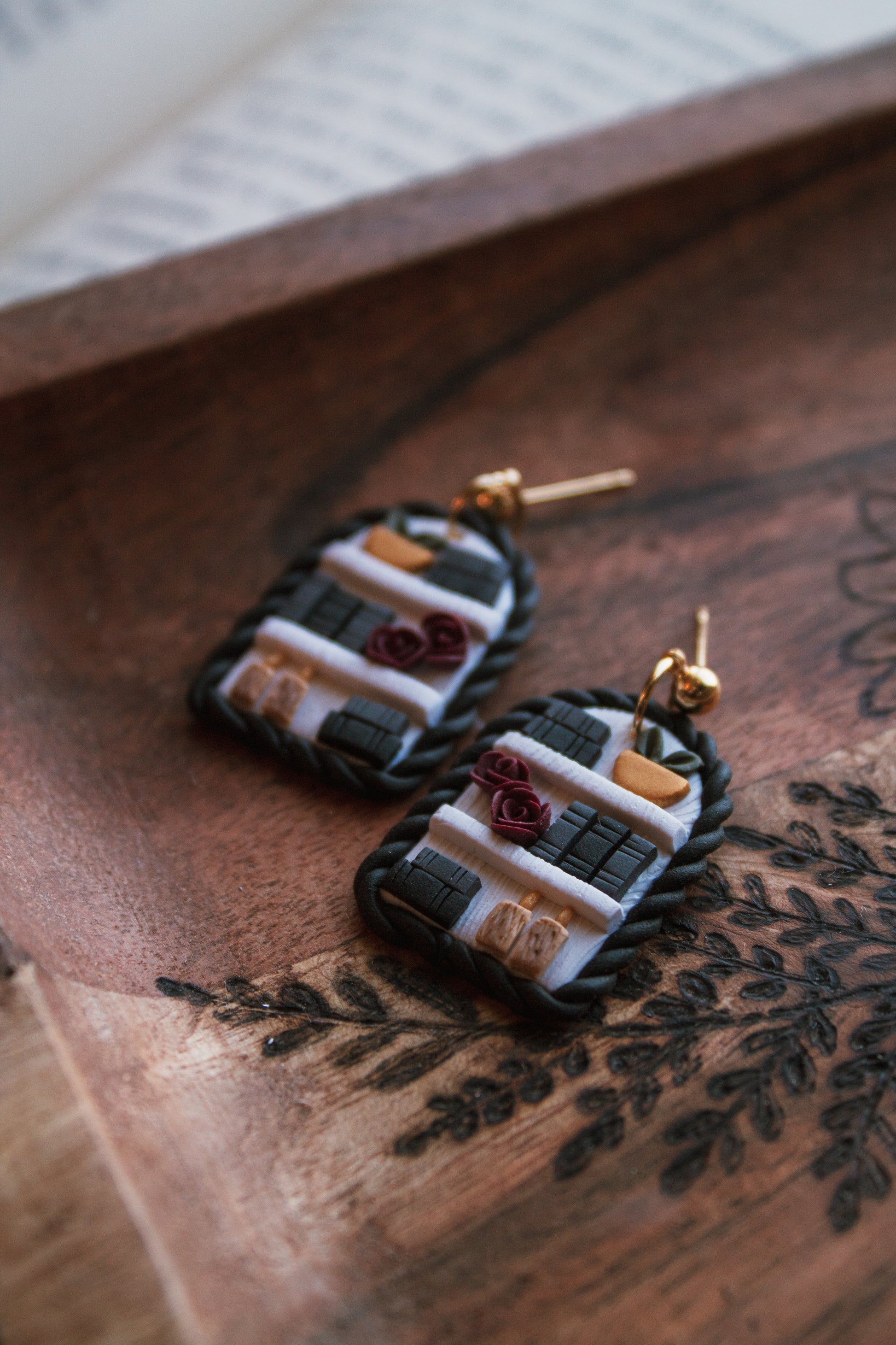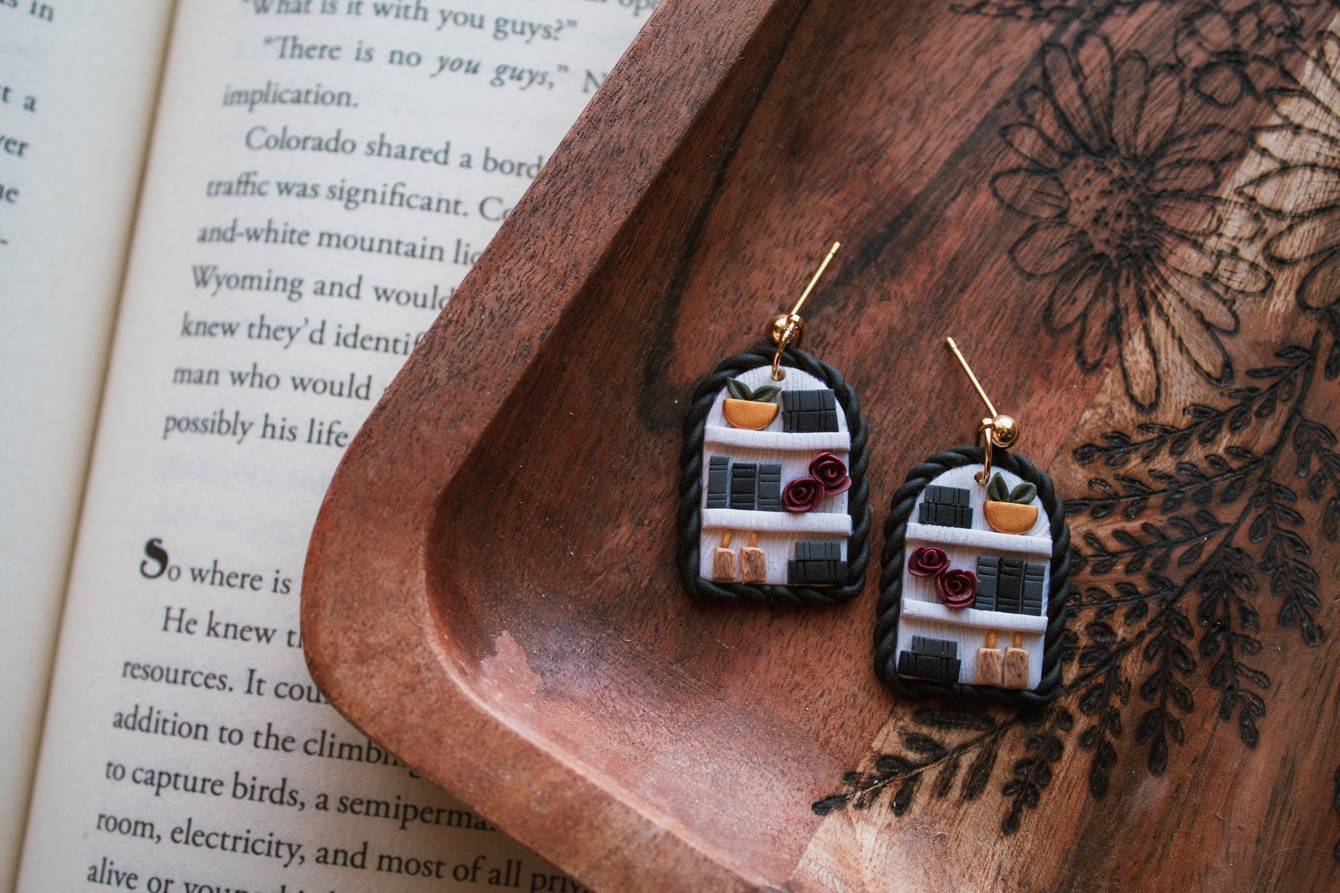 Add a touch of whimsy to your look with our Dark & Romantic Bookshelf Earrings. Handcrafted from polymer clay, these unique earrings feature delicate roses and rustic candles on a bookshelf backdrop. Perfect for adding a playful touch to any outfit.