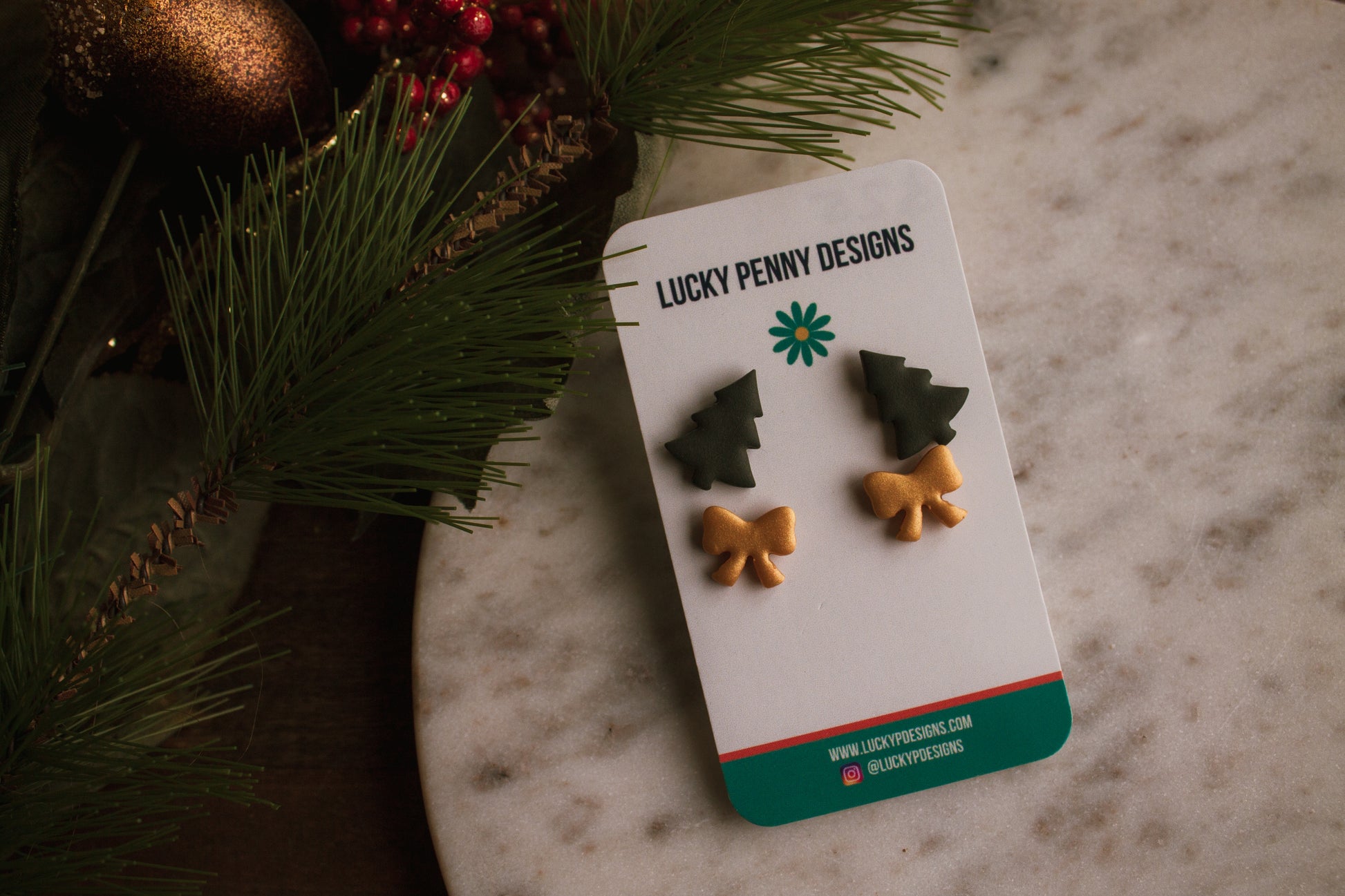 Unwrap some holiday cheer with the Gold Bows and Christmas Tree Stud Duo. These charming earrings feature delicate Christmas tree and gold bow studs, adding some festive charm to any outfit. Perfect for spreading holiday joy (and style) wherever you go!