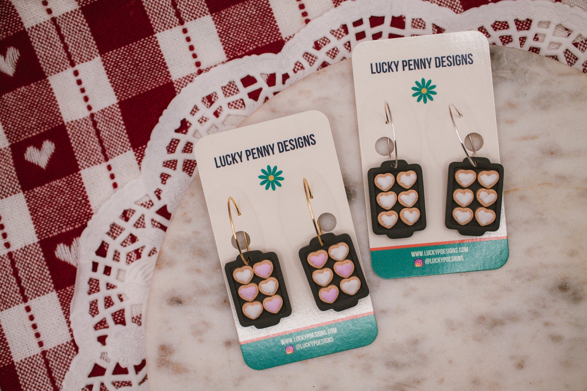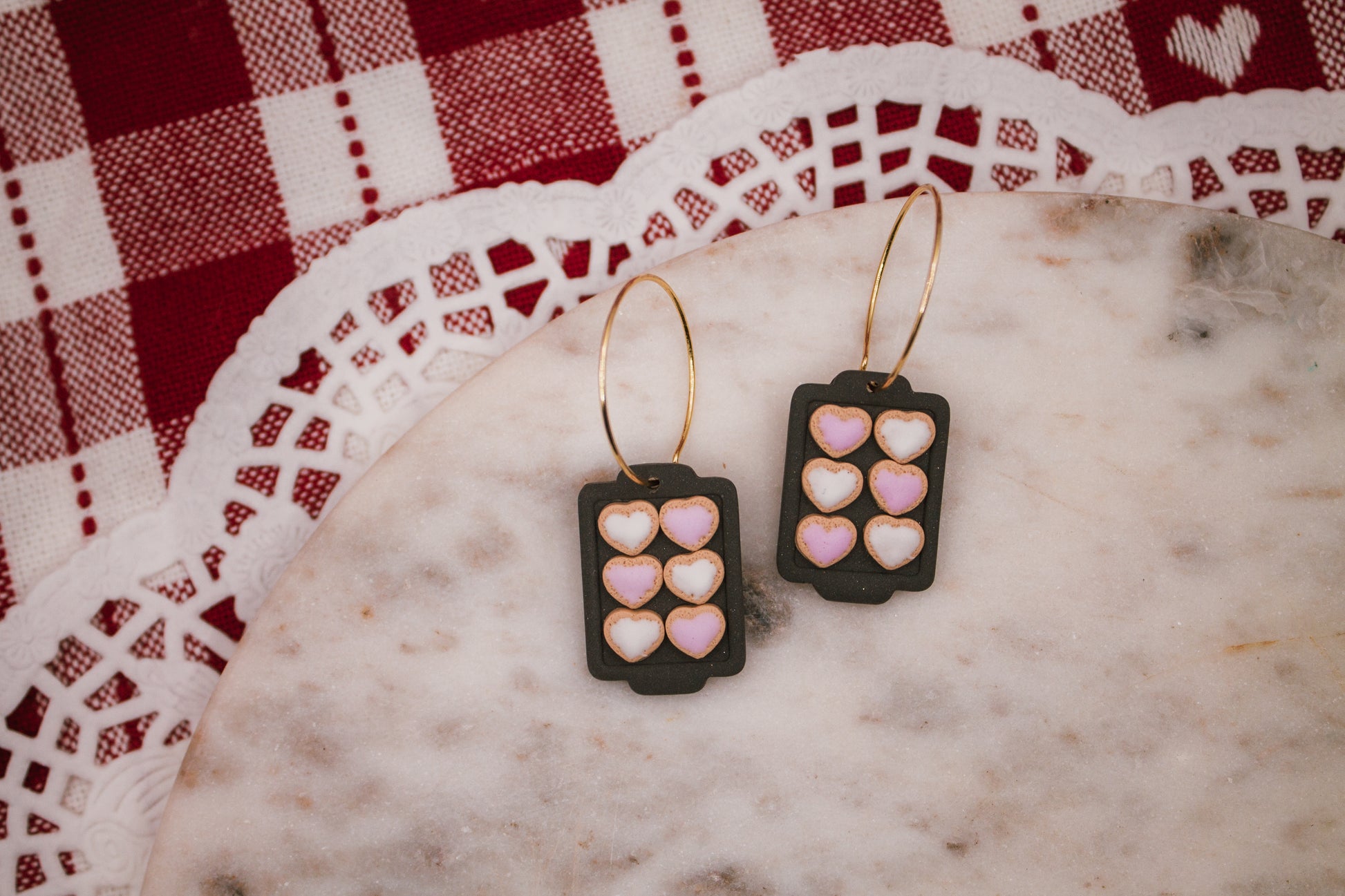 Bake up some style with these adorable heart cookie on cookie tray earrings! These whimsical hoops feature a sweet design that celebrates all things cozy and delicious. Perfect for cookie enthusiasts, bakers, and anyone who loves a touch of sugary charm, they're guaranteed to bring smiles wherever you go. Lightweight and fun, these playful earrings are the perfect accessory for expressing your love of treats and all things warm and fuzzy. A delightful way to show off your sweet personality!
