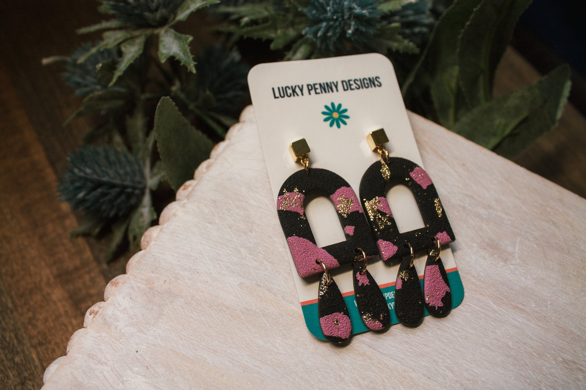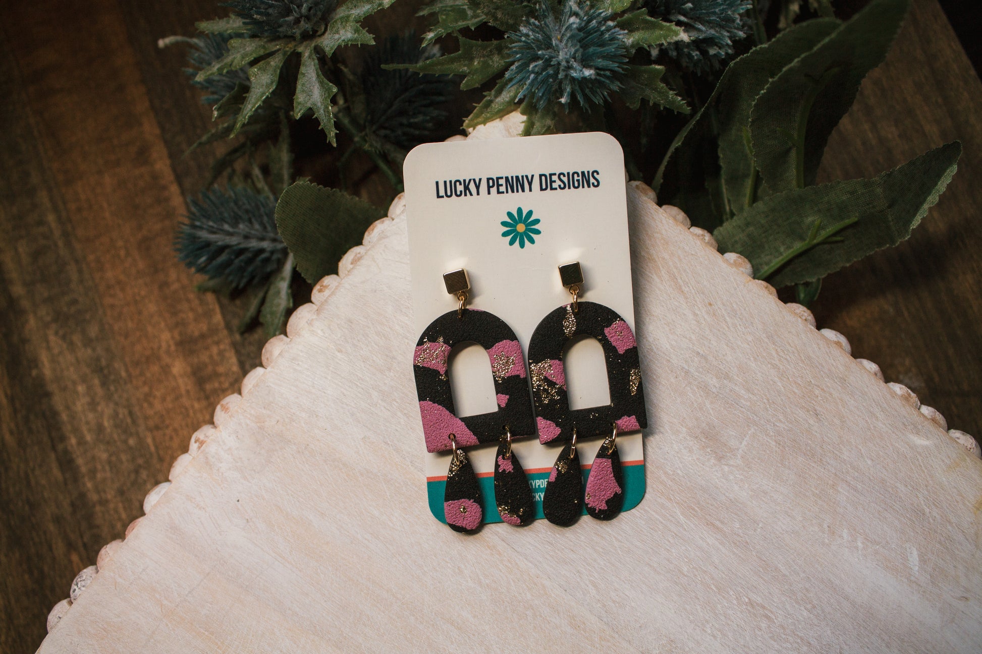 Black and pink marbled arches with flecks of gold, made from polymer clay.