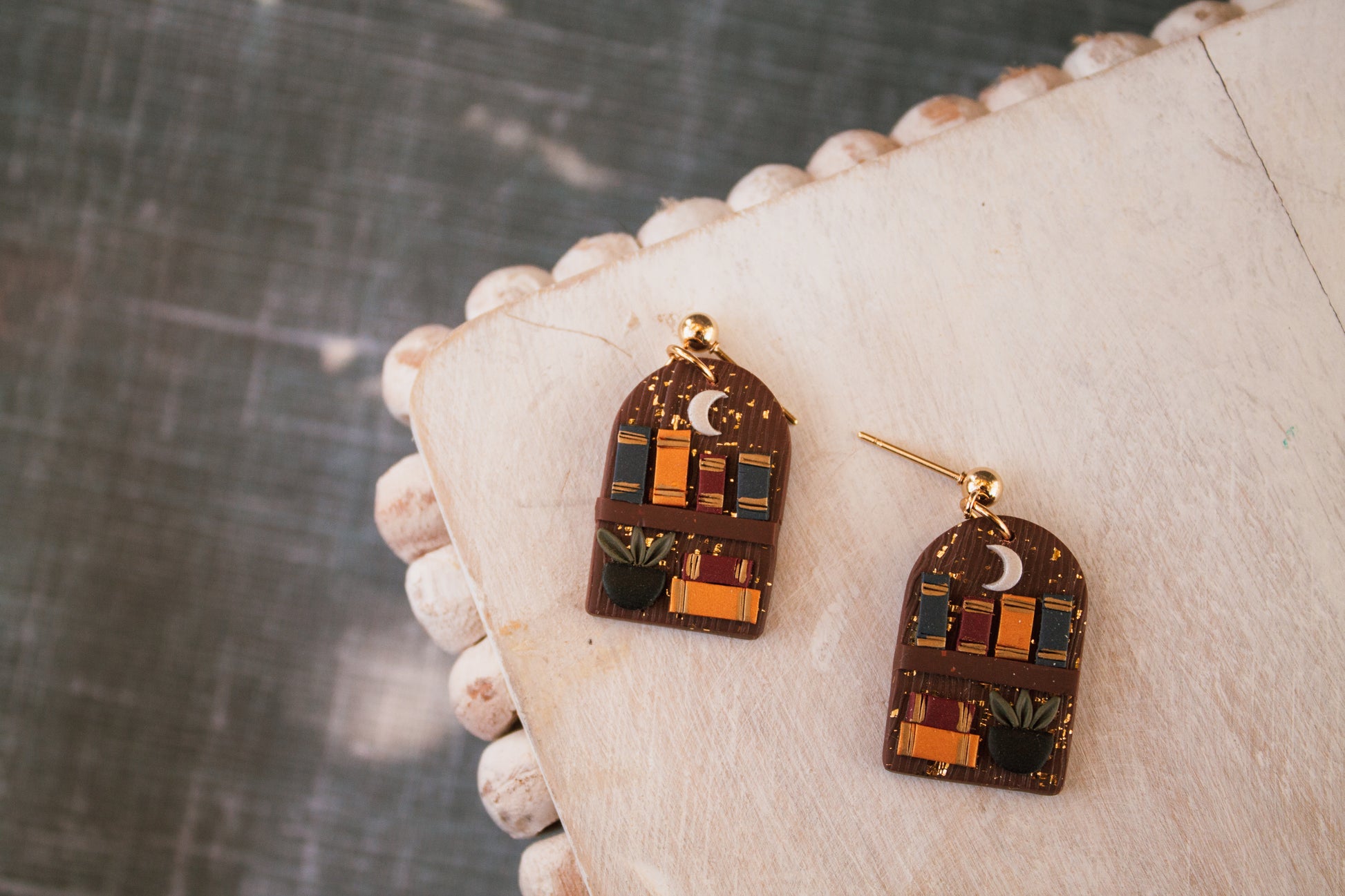 Make a statement with these adorably unique Moon Bookshelves! These mini dangle earrings feature a beautiful moon on the top of the bookshelves - for a heavenly mix of style and sophistication. Start your literary journey with these one-of-a-kind earrings! 📚