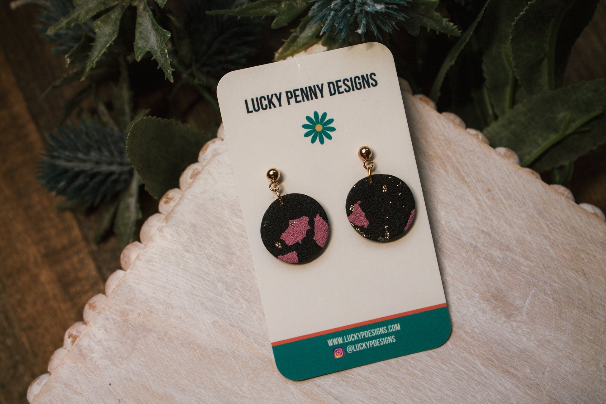 Black and pink dangles with flecks of gold, made from polymer clay.