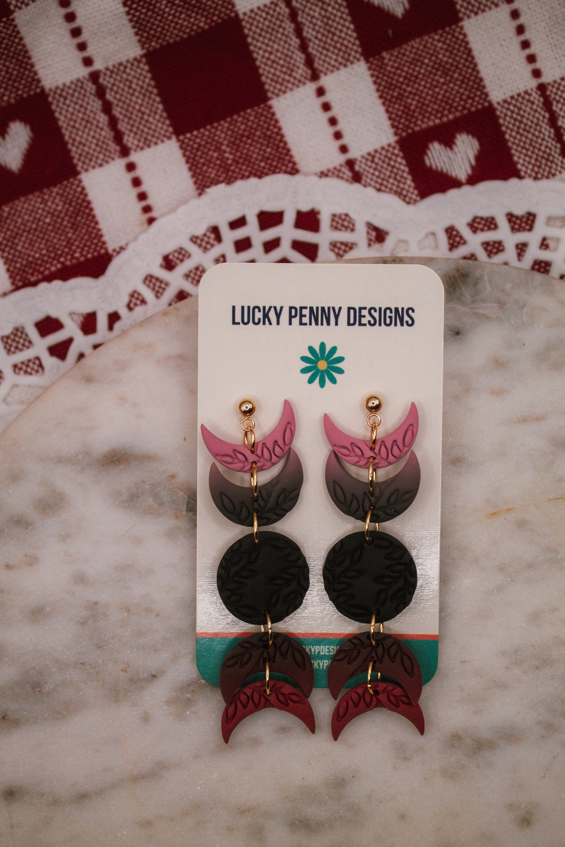 Celestial vibes meet bold color magic with these enchanting moon phase earrings. Featuring a stunning ombre gradient that flows from soft pink through deep black to rich red, each pair captures the mystical beauty of lunar cycles in wearable art. Perfect for stargazers, astrology lovers, and anyone who wants to add a touch of cosmic flair to their everyday look. These statement earrings are conversation starters that celebrate the moon in all its phases—literally and stylishly.