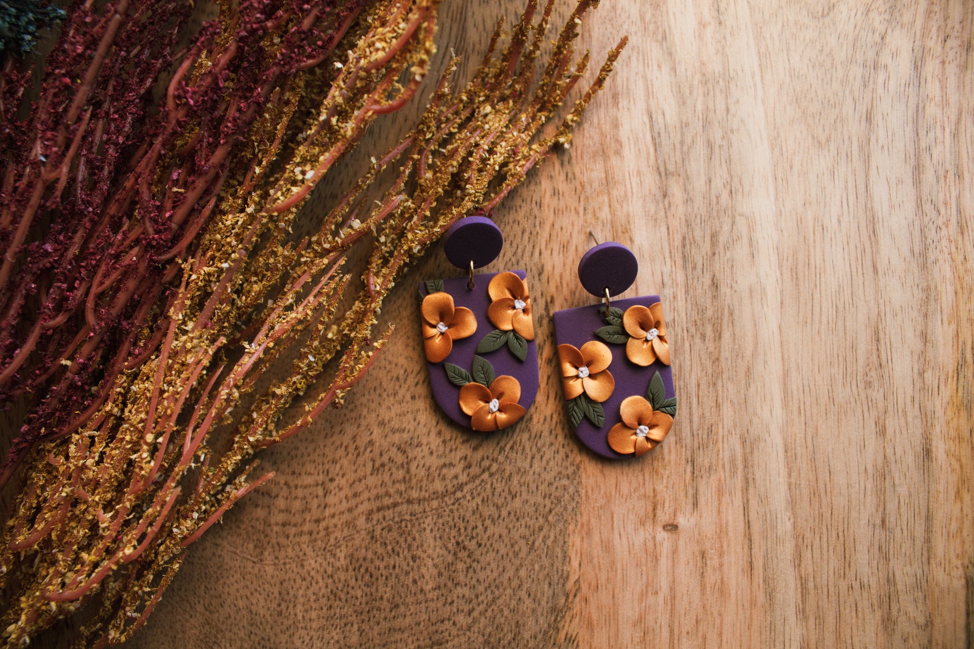 Add a pop of color and whimsy to any outfit with these Purple and Gold Floral Dangle Earrings. Handmade with lightweight materials, they are easy to wear and will make you feel like a flower child. Perfect for a playful and stylish look!