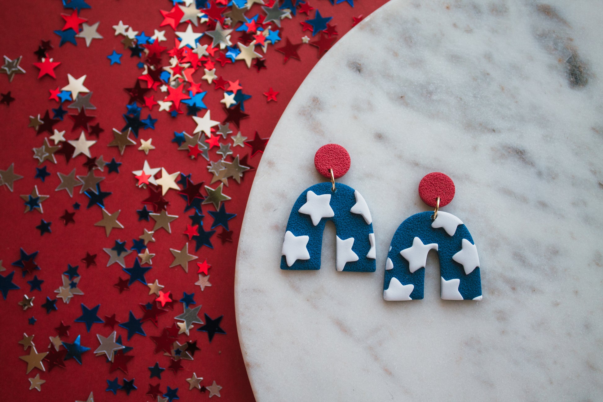 Add a pop of color to your patriotic outfit with our Star Rainbow Dangles! These quirky earrings, in the shape of a rainbow with stars, are perfect for celebrating the Fourth of July. Show off your playful side with these unique accessories.