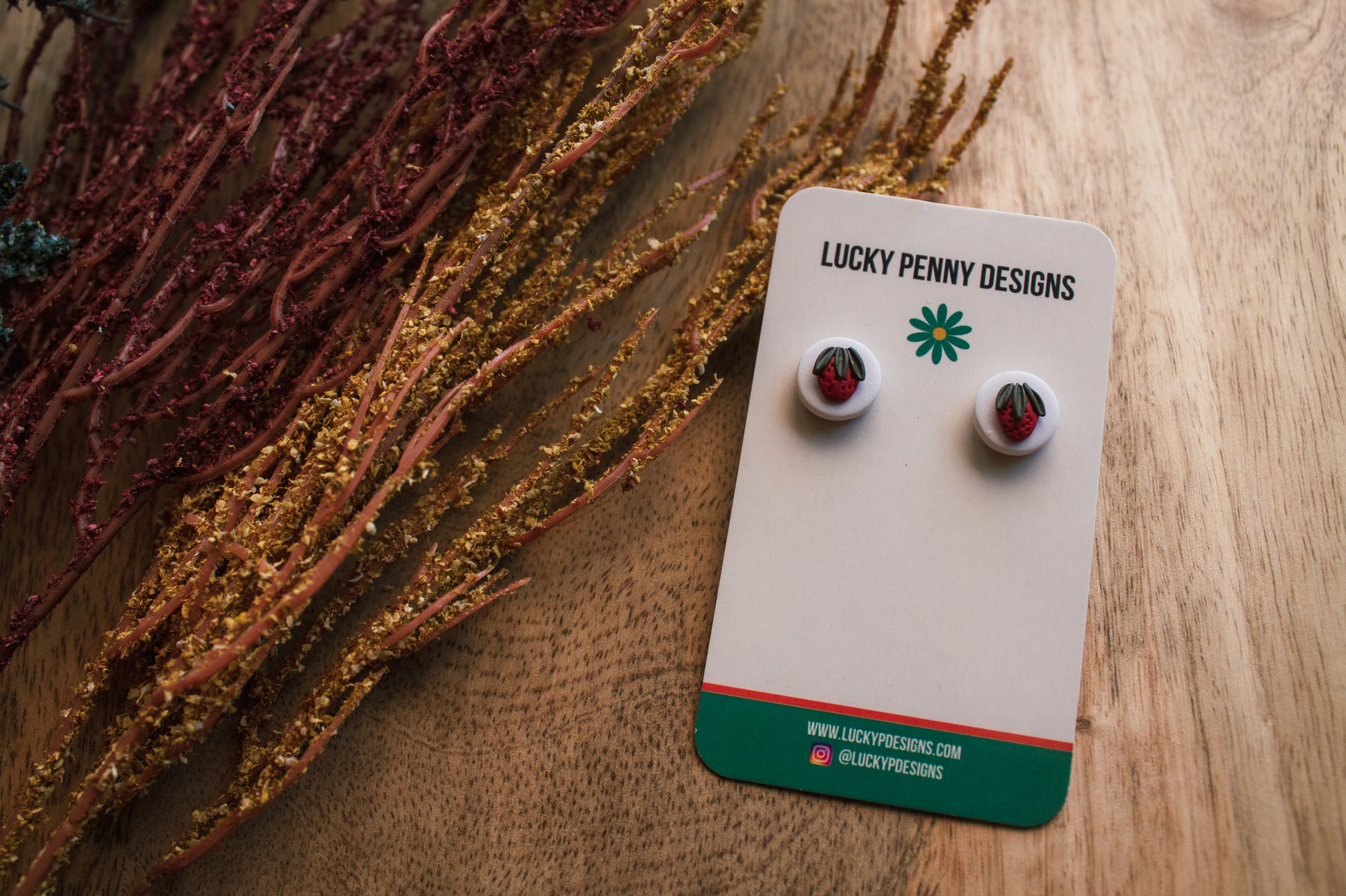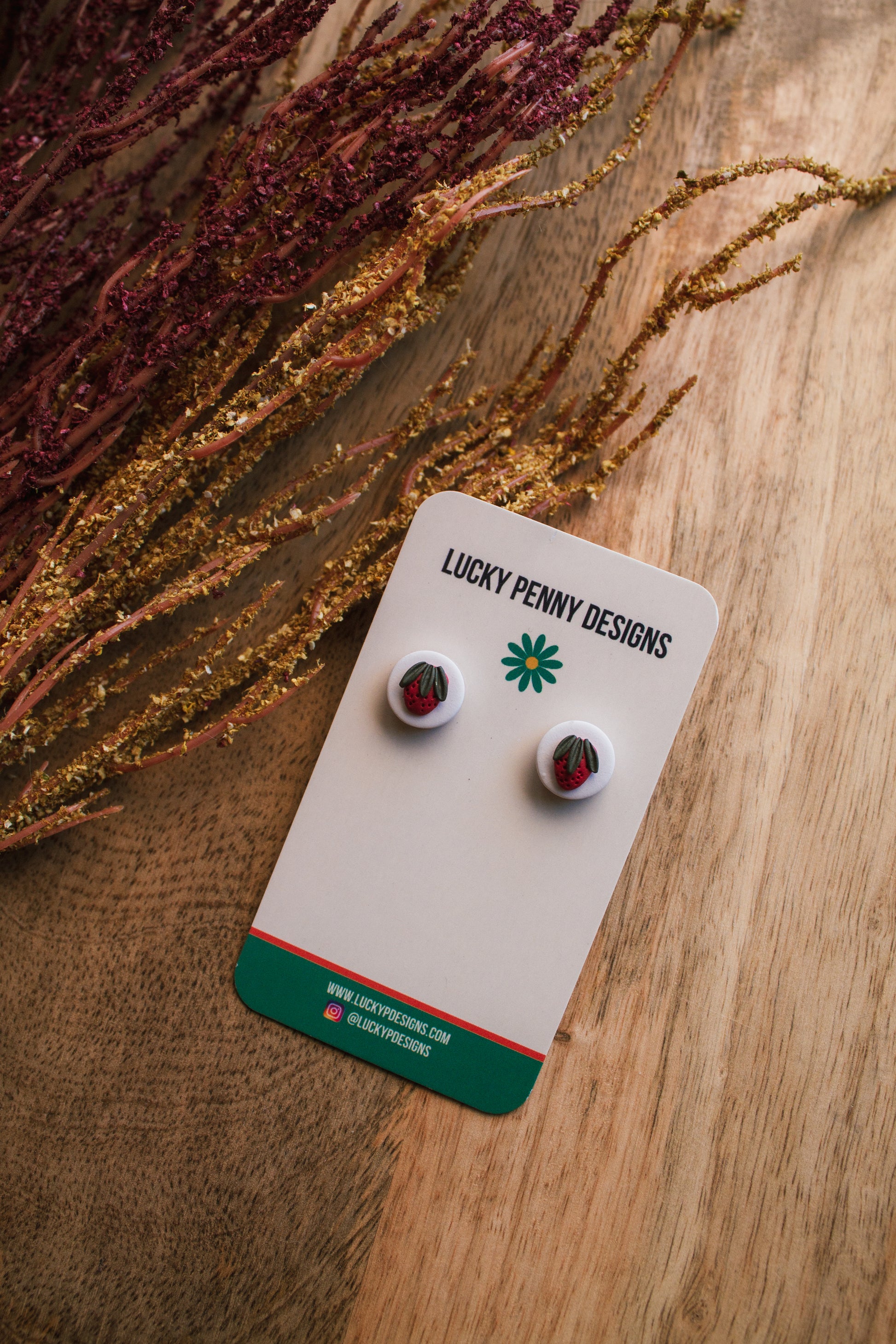 Brighten up any outfit with our White Strawberry Studs. These playful polymer clay earrings are a simple, yet fun accessory for any occasion. Perfect for those who don't take themselves too seriously and want to add a touch of quirkiness to their style. Sweeten up your look with these strawberry studs!